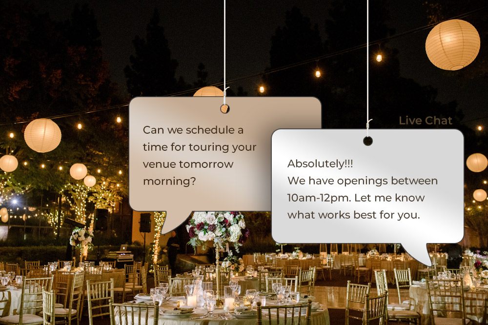 A live chat for your wedding venue will answer and guide the bride and groom through their wedding venue rental process.
